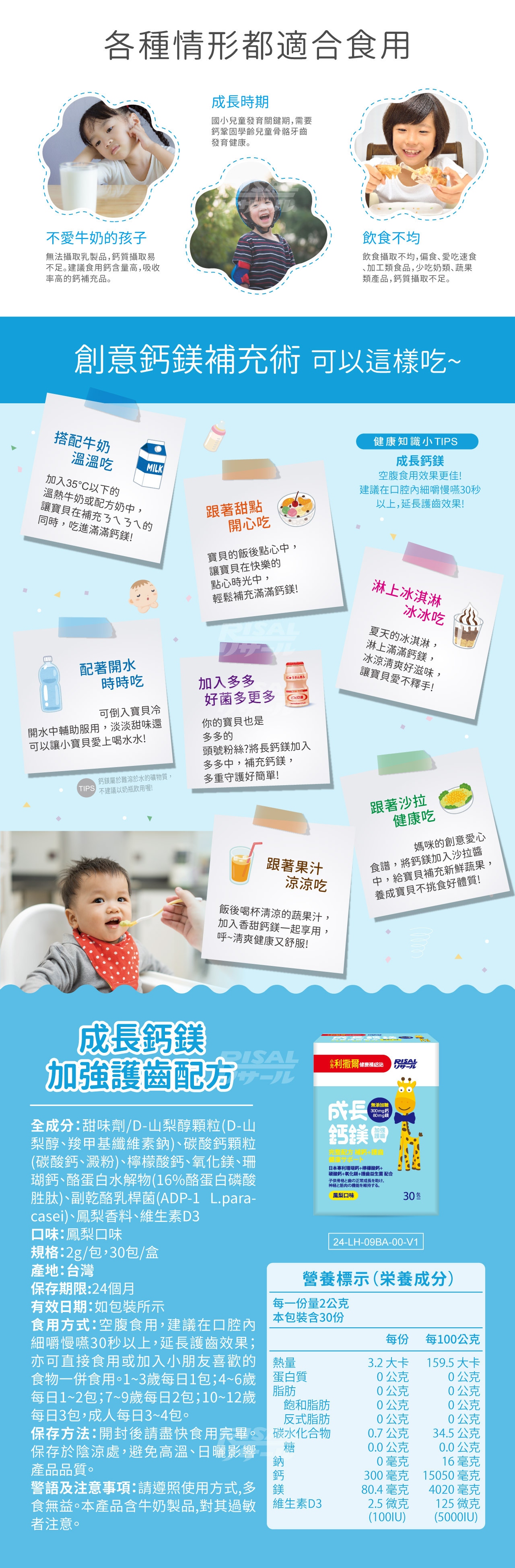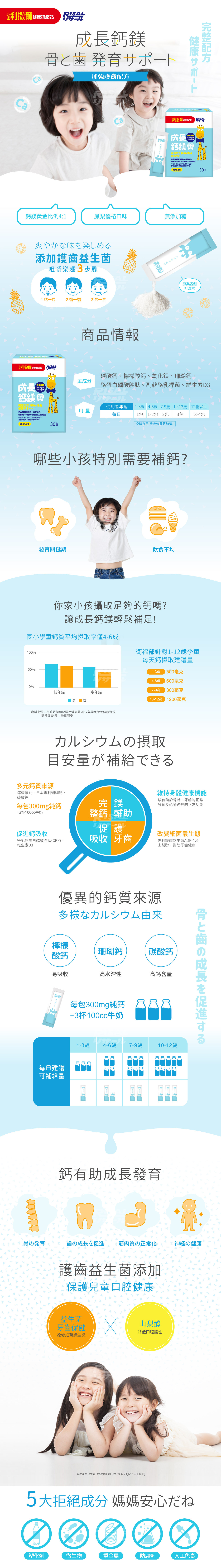 專為兒童設計,細緻顆粒方便食用。含日本專利珊瑚鈣、檸檬酸鈣、碳酸鈣三種鈣質來源,幫助維持神經與肌肉正常功能,另添加專利護齒益生菌ADP-1及山梨醇,改變細菌叢生態,維持牙齒健康。